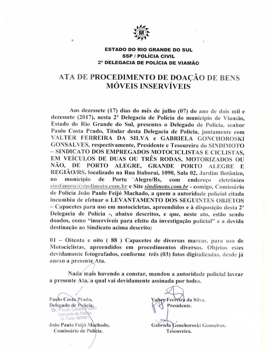 O Sindimoto recebeu como doação dezenas de capacetes da 2 Delegacia de Polícia de Viamão; numa parceria pioneira que visa que estes equipamentos, apreendidos em diversas ocorrências e que não foram retirados pelos seus proprietários, possam ser doados aos cadastrados.